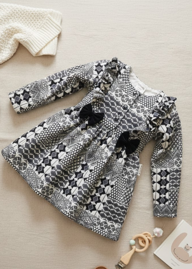 Details: Mixed geometric patterns (diamonds, triangles, dots, hexagons), ruffle sleeve trim, two velvet bows at waist, adjustable fabric belt, back zipper, gathered skirt