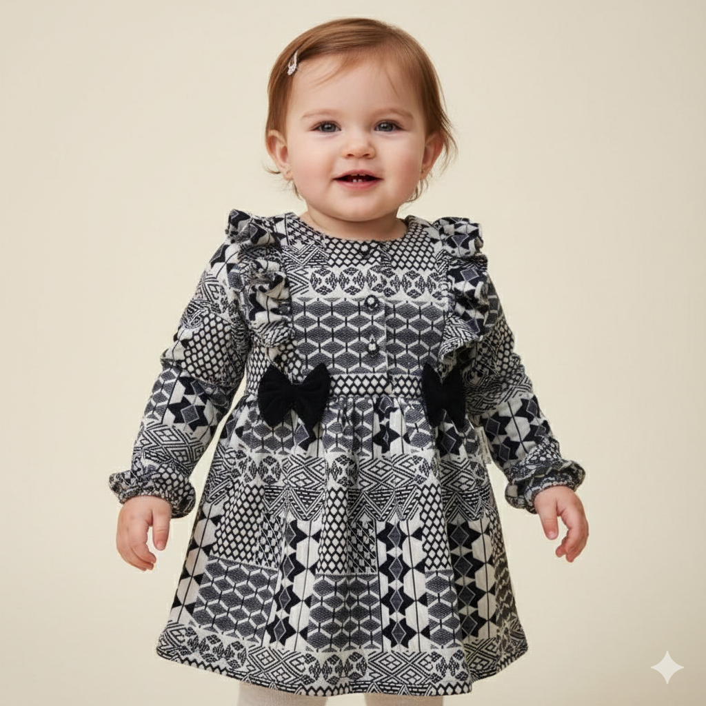This isn’t just a dress – it’s wearable art. The sophisticated geometric print gives your little one a fashion-forward edge while remaining completely age-appropriate. The quality construction means it holds up beautifully through countless wears and washes, making it a piece you’ll reach for again and again. The dramatic ruffle sleeves and bow details create picture-perfect moments, while the comfortable fit ensures she’ll actually want to wear it.