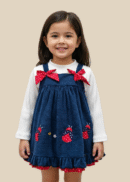 She’s crawling across the play mat, grinning at the red bows on her shoulders. You’re smiling too, because this outfit looks like it came from a boutique window but still survives applesauce smears and stroller naps. It’s cheerful, practical, and the kind of dress strangers stop to comment on at the park.